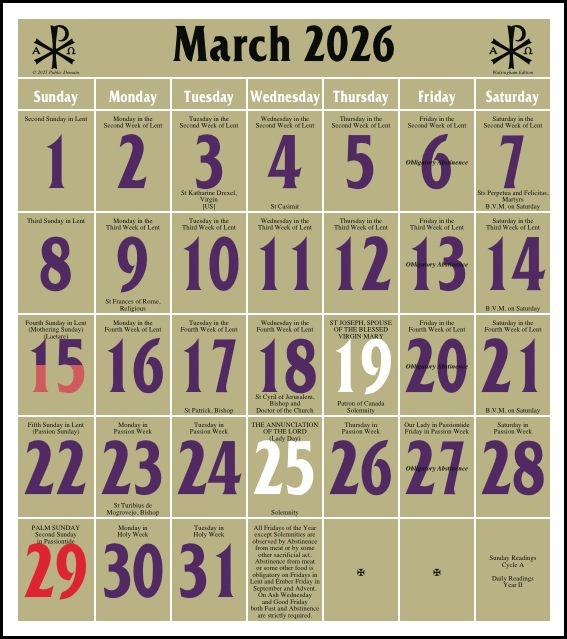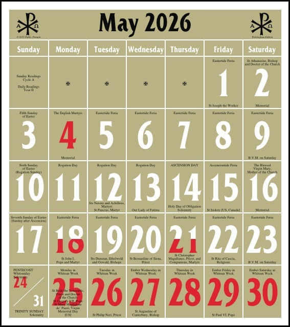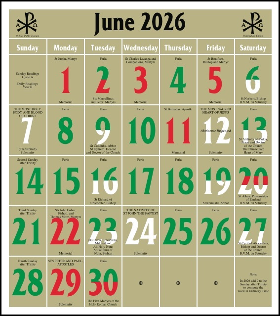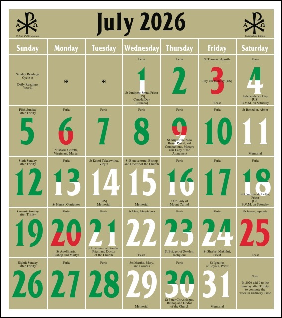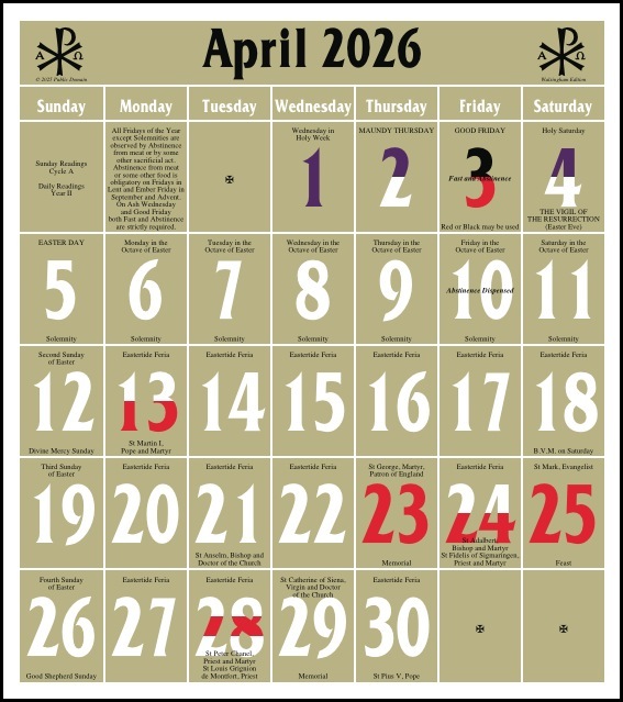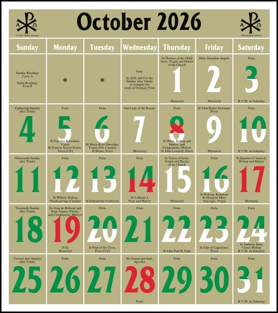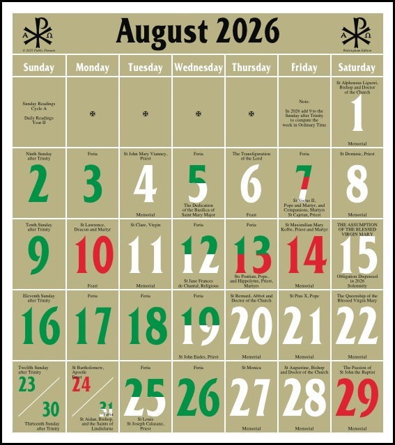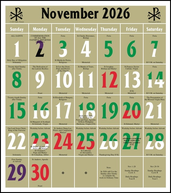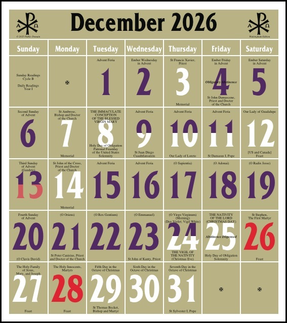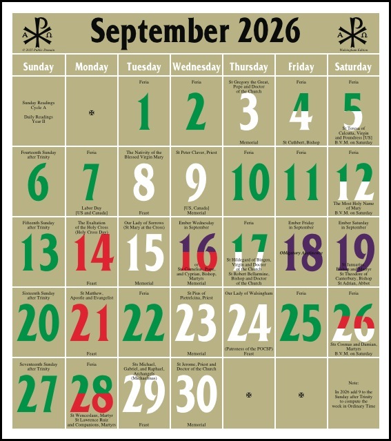 Orders for the 2026 calendar are now being accepted.Ordering info is after the preview calendar below.The calendar sets forth the observances of the Ordinariate of the Chair of St Peter as given in the official Ordo Book approved by the Bishop. The ordering deadline is November 2nd. Calendars will ship in November and December to arrive by Advent II. All payments received after subtracting printing and mailing costs are donated to the Bishop's Appeal. The 2025 Ordo Calendar project raised $991.13 for